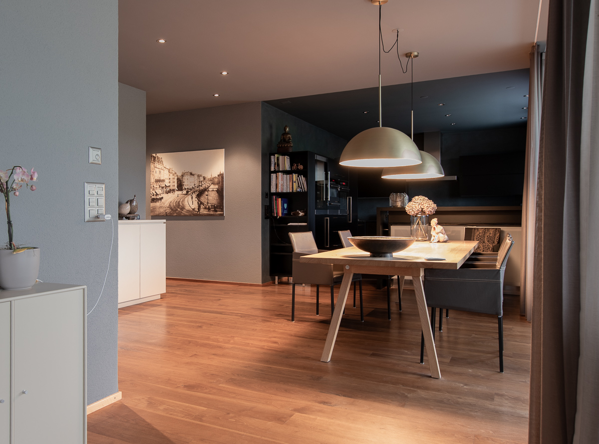 Im Mehrzweckraum entstand ein grosszügiger, multifunktionaler Wohnraum, den wir in hellen Farbtönen gestaltet haben – abgestimmt auf das neu verlegte Parkett von Markus Schweizer sowie die neu erstellte Küche von Sibylle Frei. Ebenso wurden die Sockelleisten mittels traditioneller Handwerkstechnik des Maserierens farblich in Platinoptik angepasst. Abgerundet wird das Gesamtbild durch farblich abgestimmte, lackierte Elektroabdeckungen.