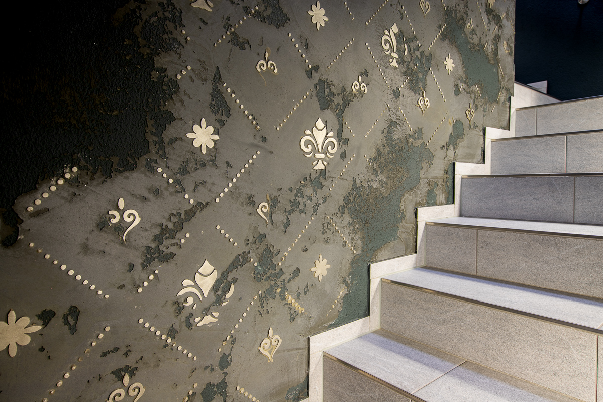 Das bestehende, kühl wirkende Treppenhaus soll nun im Mittelpunkt stehen, wobei der Kubus in edler Antikverputztechnik von dunklen Farbtönen umhüllt, wirkungsvoll in Szene gesetzt wird. Abgerundet wird das Konzept durch kontrastreiche Türen und Zargen in gebürsteter Platinoptik.
