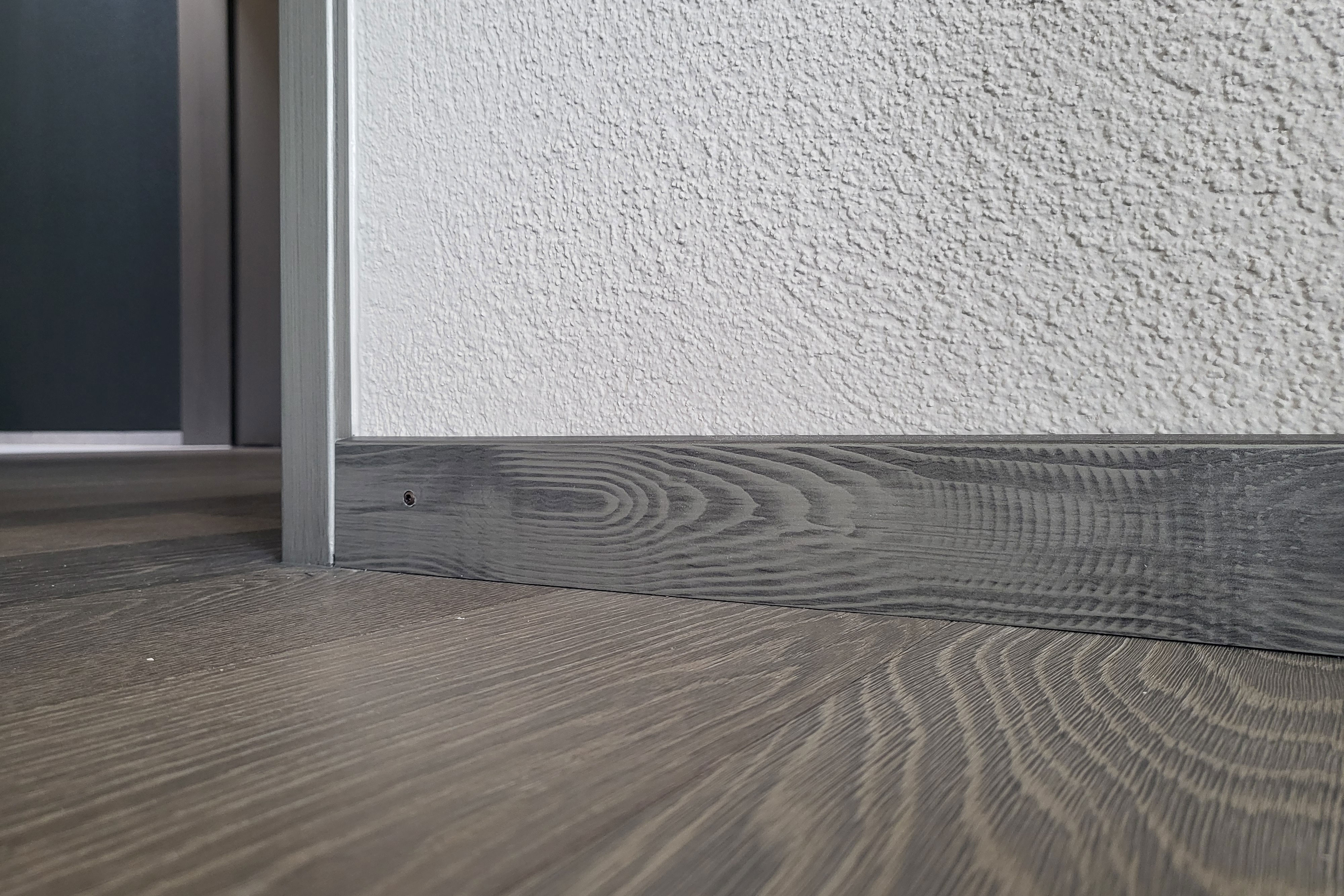 Die Nischenküche im Wohnraum hat uns inspiriert, daraus eine „Cocoon"-Kochoase entstehen zu lassen. Die bestehende, intakte Küche wurde von unserem Partner Vincent Mertz in hochwertiger Autolackqualität mattschwarz lackiert, umhüllt von petrolblauem Terra di Pietra sowie einer im selben Farbton gestrichenen Decke. Wohnraum und Korridor runden das Konzept mit einem Anstrich im passenden, mittleren Grauton harmonisch ab.